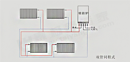 成都散熱器安裝方式一:雙管同程式連接法,一般多用于五組散熱器以上的工程,供熱均勻.