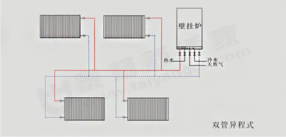 成都散熱器安裝方式二:雙管異程式連接法,用材較省,一般多少于五組散熱器以下的工程,組數太多用這種連接方法容易出現后面組數的散熱器熱不起來的現象;