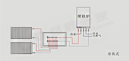 成都散熱器安裝方式三:章魚式連接法,需要添加分集水器,效果最佳,但費用略高.