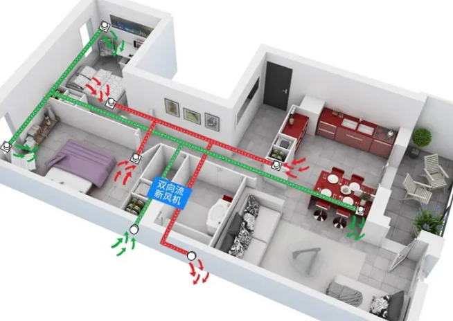 在雙向流新風系統的基礎上增加了全熱交換模塊,在換氣過程中盡量減少室內能量流失,實現高效通風換氣,夏季利用室內排出的冷氣的能量,盡量把外面的熱空氣預冷后再送入室內,室內冷量損失少;冬季利用室內排出的暖氣的能量,盡量把外面的冷空氣預熱后再送入室內,室內熱量損失少。